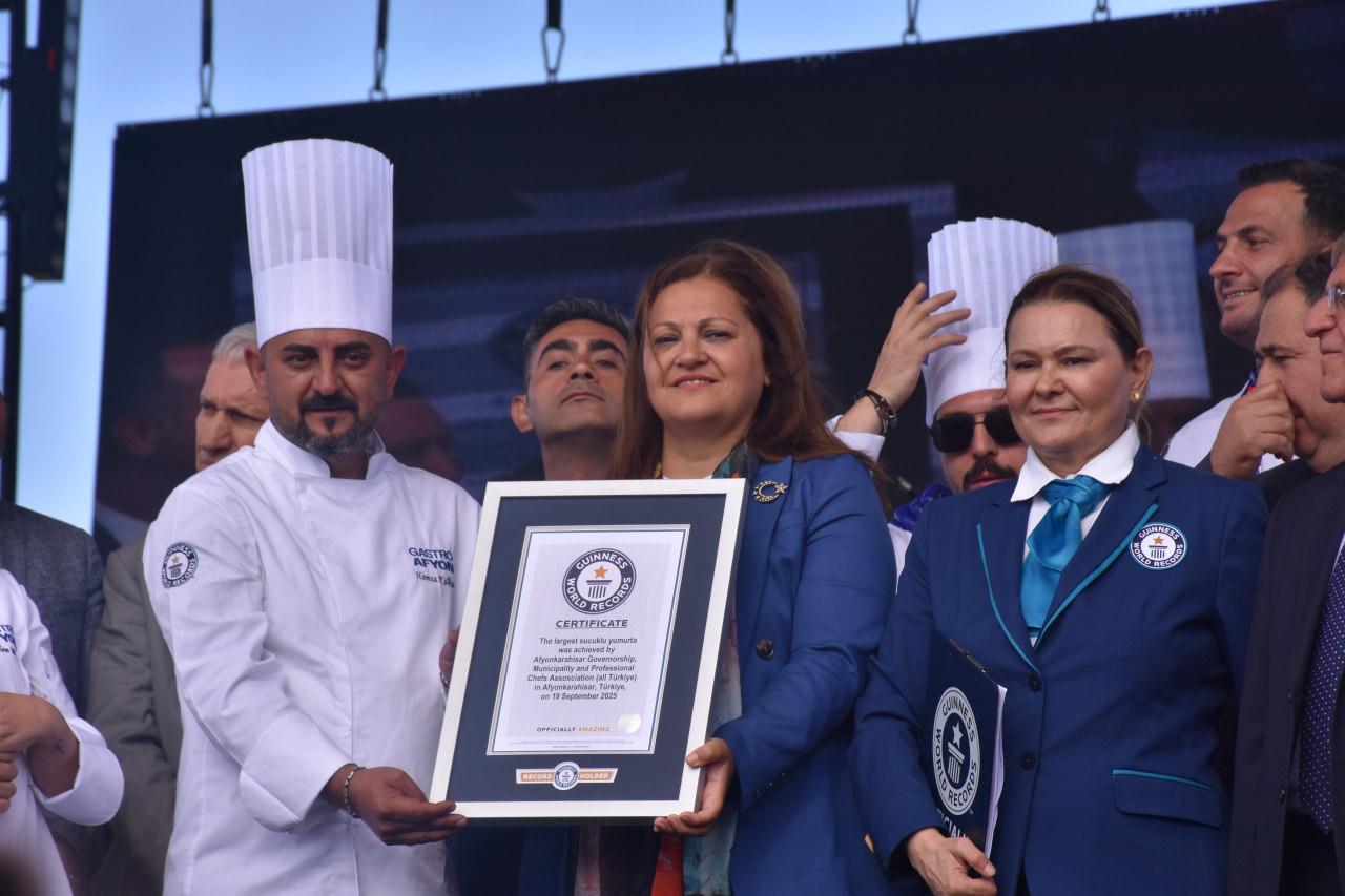 Sucuklu yumurtanın Guinness Dünya Rekorları kitabına girdiğini ve tescillendiğini açıklayan Gemici, belgeyi Afyonkarahisar Belediye Başkanı Burcu Köksal’a teslim etti.