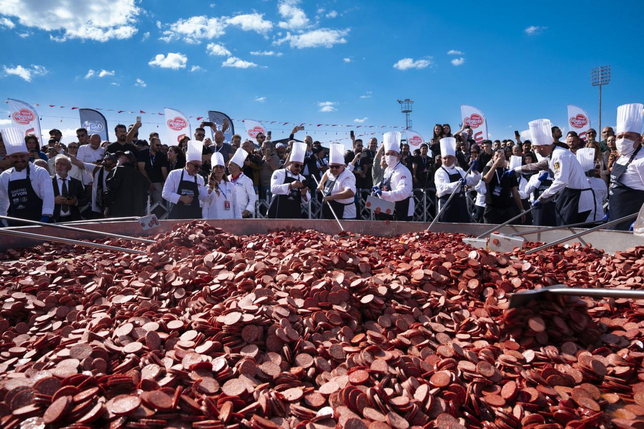 Konuşmaların akabinde vilayet protokolü, Guinness Dünya Rekorları kitabına girmesi için şenliğe katılan 30 şefin ve sponsorların takviyesiyle 25 metrekarelik dev tavada 1 ton sucuk, 15 bin gezen tavuk yumurtası, sıvı yağ ve tuzun kullanıldığı sucuklu yumurtanın startını verdi.