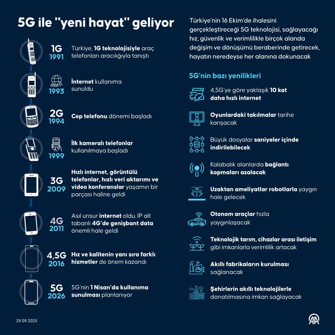 Bu ilanla ihale süreci resmen başlarken, operatörlerin 11 frekans paketine yönelik katılacağı 5G ihalesi için tarih 16 Ekim olarak belirlendi.