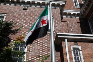 Washington’da 18 Mart 2014’te kapatılan büyükelçilik binasında, Dışişleri Bakanı Esad Hasan Şeybani, Suriye Arap Cumhuriyeti bayrağını göndere çekti.