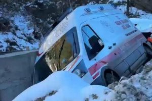 Kaza, gündüz saatlerinde Geçirimoluk Değirmendere mevkisinde meydana geldi. Hasta almaya giden ambulans, yoldaki buzlanma nedeniyle denetimden çıktı.