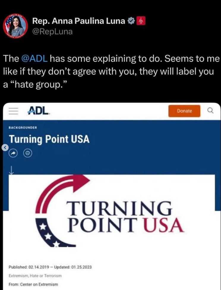 Cumhuriyetçi Kongre üyesi Anna Paulina Luna, ADL’nin tek taraflı hareket ettiğini belirterek, “Bana o denli geliyor ki, onlarla tıpkı fikirde değilseniz sizi çabucak ‘nefret grubu’ olarak etiketliyorlar.” tabirini kullanmıştı.