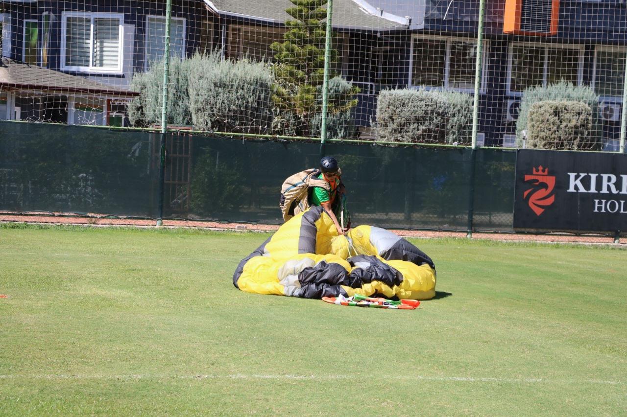 Alanyaspor’un sahasına paraşütle inip şampiyonluk kupasını teslim ettiler