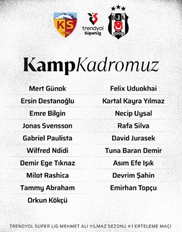 Trendyol Süper Lig’de 1. haftanın erteleme maçında yarın Zecorner Kayserispor ile karşılaşacak olan Beşiktaş’ın kamp takımı açıklandı. Siyah-beyazlılarda 10 futbolcu kafilede yer almadı.