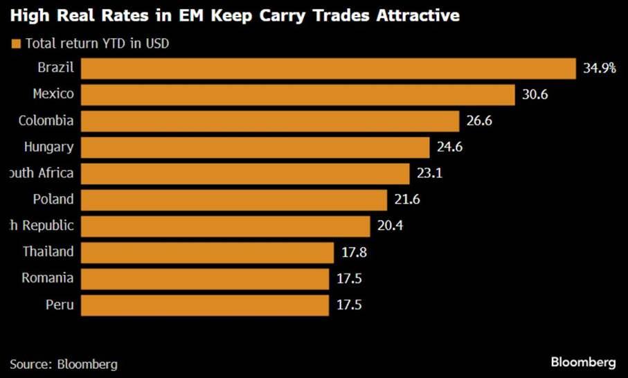 “Yüksek gerçek faizler gelişen ülkelerde carry trade’i cazip kılıyor” başlıklı Bloomberg grafiğinde, Brezilya yüzde 34,9’luk getirisiyle birinci sırada.