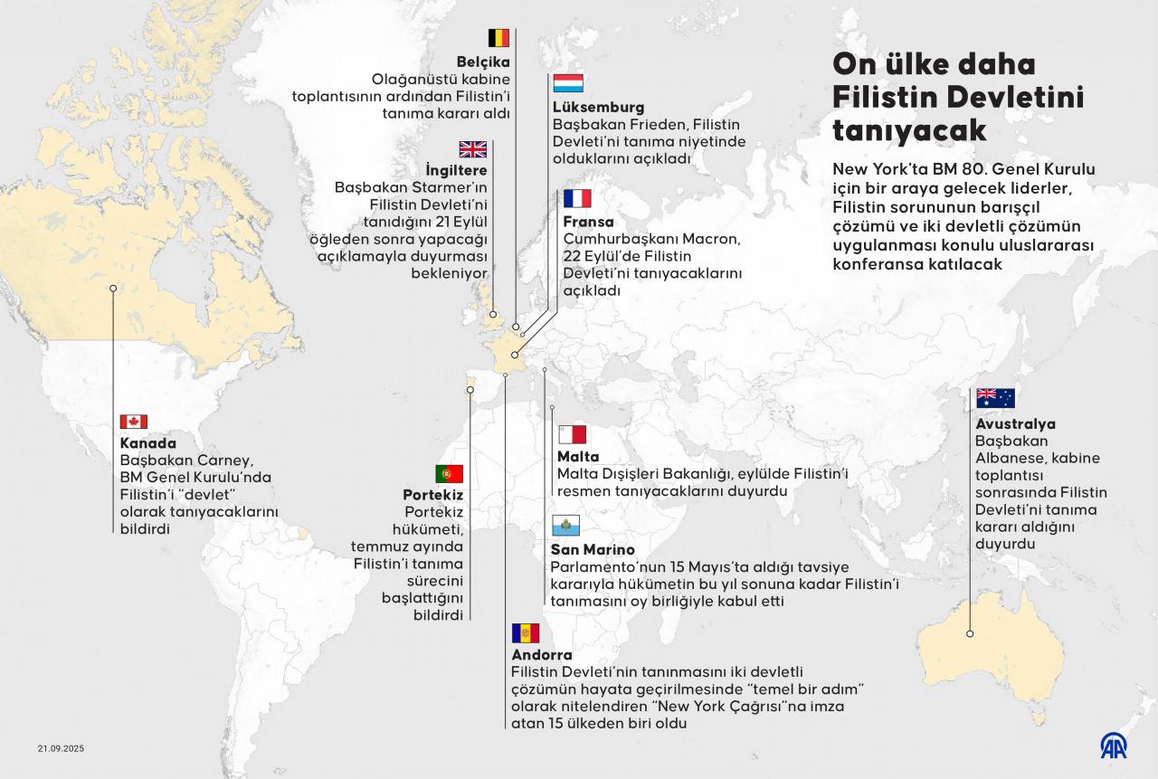 Söz konusu 10 ülkenin BM Genel Şurasında yapması beklenen açıklamalarıyla, Filistin Devletini tanıyan ülke sayısının 157’ye çıkması öngörülüyor.
