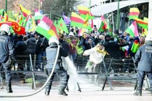 Belçika’nın başşehri Brüksel’deki PKK/SDG yandaşları da dün sabah Avrupa Parlamentosu (AP) binası önünde toplandı. Terör örgütünü simgeleyen paçavralar taşıyan PKK/SDG yandaşları, örgüt lehine sloganlar attı. Bir müddet sonra taşkınlık çıkaran kümeye polis göz yaşartıcı gaz ve tazyikli suyla müdahale etti. Küme, AB Kurulu binasının bulunduğu Schuman Meydanı’na yürüdü. Polisin takip ettiği küme burada da slogan attıktan sonra dağıldı. Hareket sırasında helikopterler ve TOMA’larla ağır tedbir alındı.