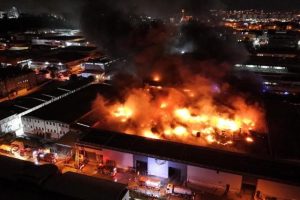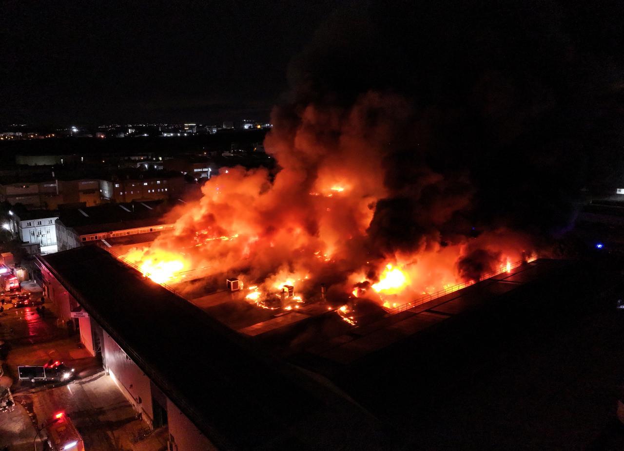Polis grupları etrafta güvenlik tedbiri alırken, itfaiye takımlarının yangına müdahalesi sürüyor.