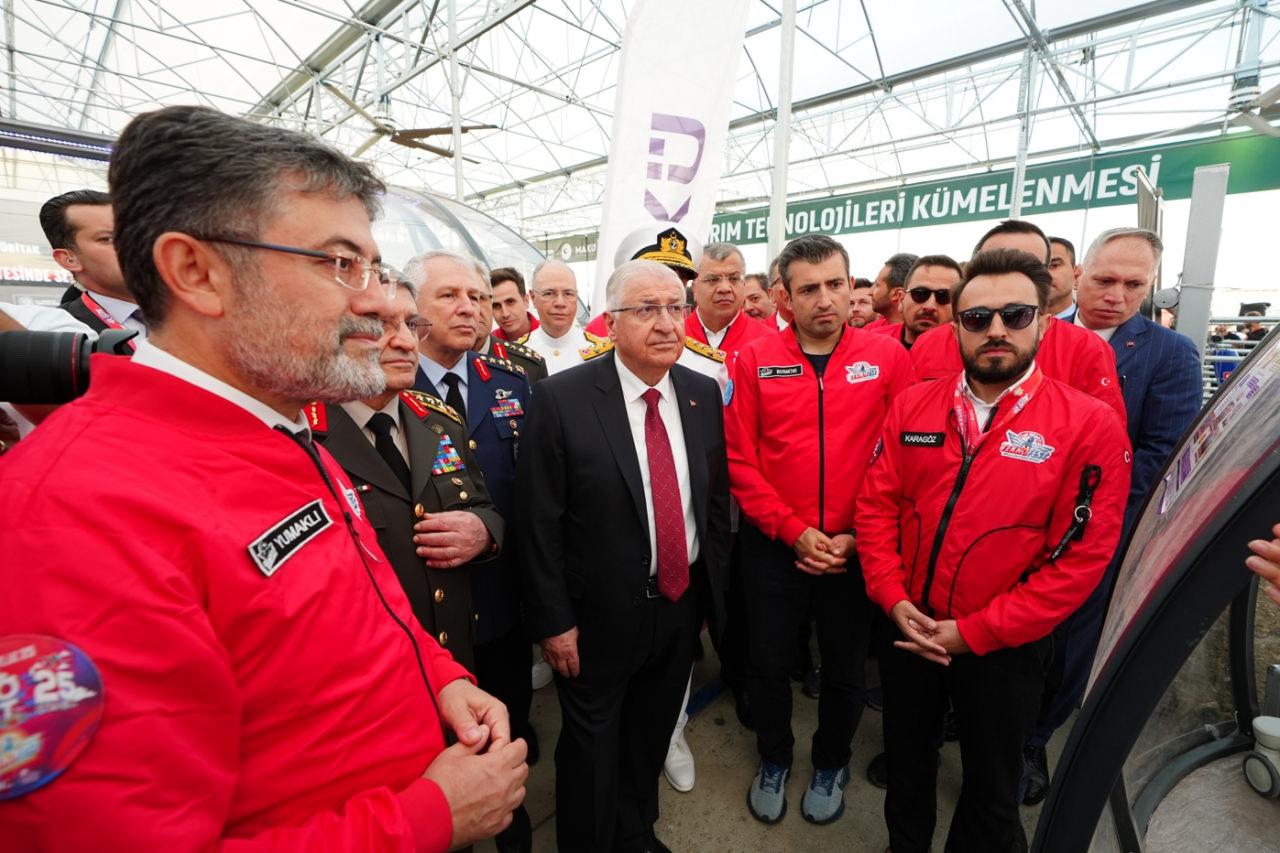 Milli Savunma Bakanı Yaşar Güler (sol 3) ile Tarım ve Orman Bakanı İbrahim Yumaklı (solda), TEKNOFEST’te yer alan Tarım Teknolojileri Kümelenmesini (TÜME) gezerek, eserlere ait bilgi aldı. Bakanlar Güler ve Yumaklı’ya TEKNOFEST Yönetim Kurulu ve Türkiye Teknoloji Kadrosu Vakfı (T3 Vakfı) Mütevelli Heyeti Başkanı Selçuk Bayraktar