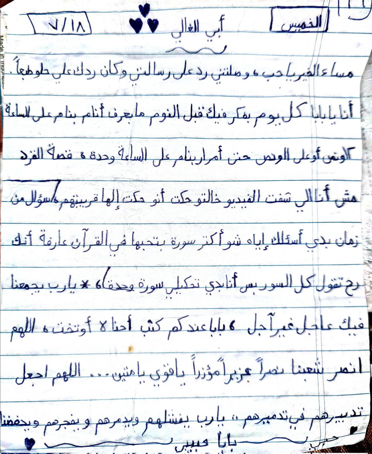 “Allah’ım halkımıza güçlü ve onurlu bir zafer nasip et. Allah’ım onların planlarını kendi yıkımları yap. Onları başarısız kıl, yok et ve bizi koru. Sevgilerimle babacığım, canım.”