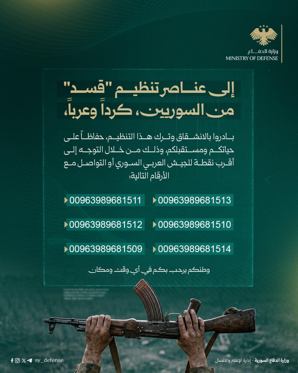 “Suriyeli SDF üyelerine, Kürt yahut Arap olsun fark etmez: Hayatınızı ve geleceğinizi korumak için bu örgütten ayrılın ve onu terk edin. Bunu yapmak için en yakın Suriye Arap Ordusu denetim noktasına gidin yahut aşağıdaki numaraları arayın: