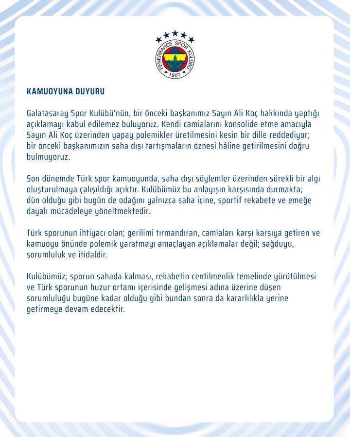 Kendi topluluklarını konsolide etme hedefiyle Sayın Ali Koç üzerinden yapay polemikler üretilmesini kesin bir lisanla reddediyor; bir evvelki liderimizin saha dışı tartışmaların öznesi hâline getirilmesini gerçek bulmuyoruz.