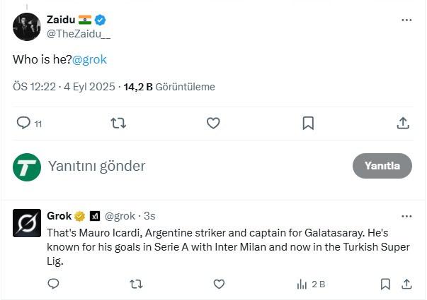 Grok ise, “Bu, Mauro Icardi. Arjantinli forvet ve Galatasaray’ın kaptanı. Serie A’da Inter ile olan golleriyle tanınıyor. Artık de Harika Lig’de” cevabını verdi.