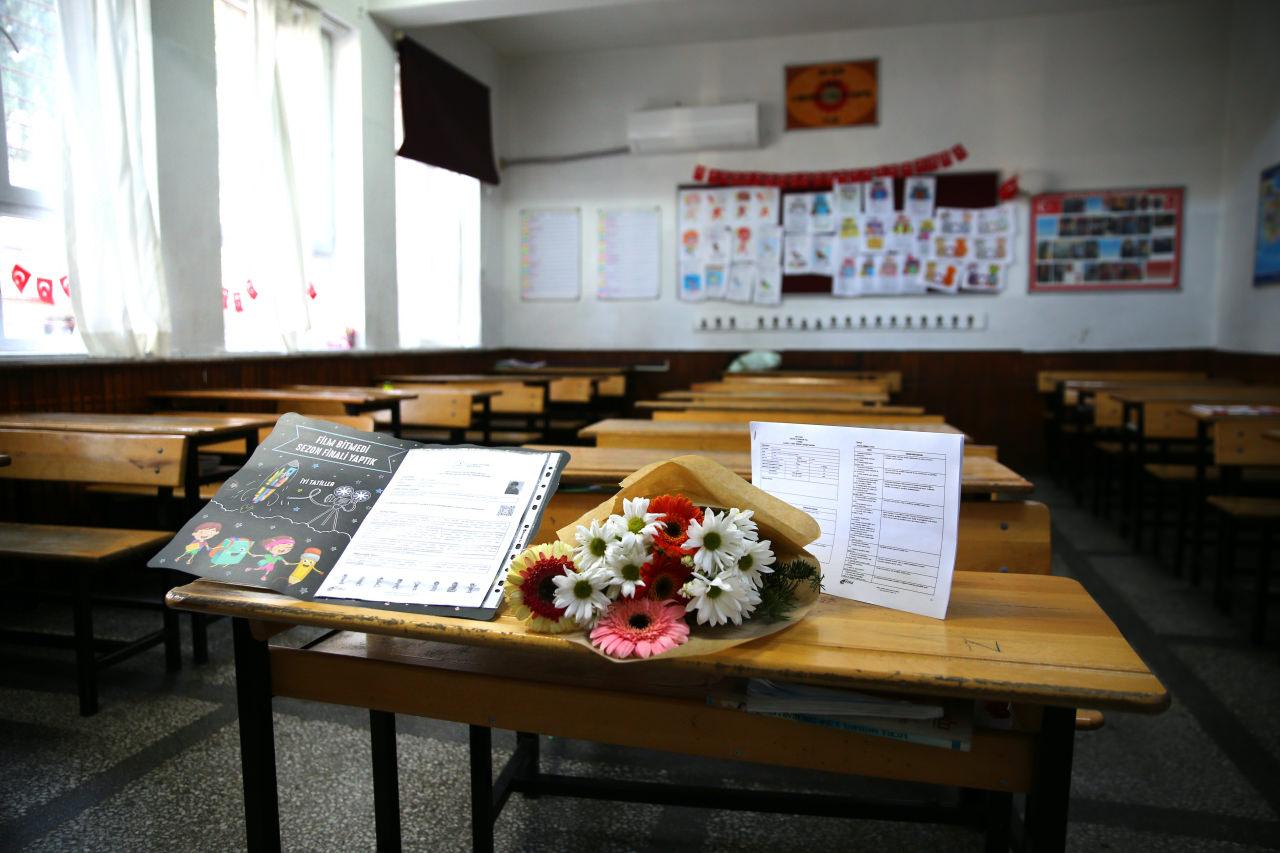 Sınıf öğretmenleri ve arkadaşları, 2. sınıf öğrencisi Ada ile ana sınıfı öğrencisi Mert’in karnelerini çiçeklerle sıralarına bıraktı.