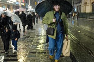 Taksim Meydanı’nda yağmura hazırlıksız yakalananlar, iş yerleri ve binaların altlarında yağmurdan korunmaya çalıştı.