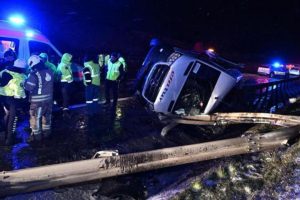 Kuzey Etraf Otoyolu Boğazköy İstiklal mevkisinde İstanbul Havalimanı istikametine seyir halindeki F.S. yönetimindeki servis minibüsü kar yağışı sonrası kayganlaşan yolda denetimden çıkıp bariyerlere çarparak devrildi.