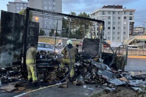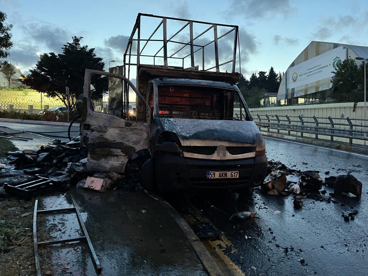 Küçükçekmece’de alev alan kargo yüklü kamyonet küle döndü