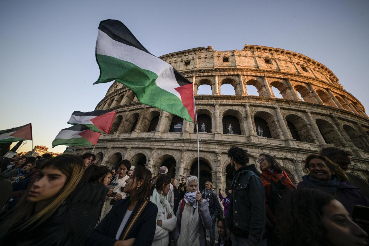 İsrail’in müdahalesine sert yansıların yükseldiği İtalya’nın başşehri Roma’da bir ortaya gelen göstericiler Sumud Filosu’na yönelik yasa dışı müdahaleyi kınarken, İtalyan sendikaların davetiyle yarın ülkede gerçekleştirilmesi beklenen greve verecekleri takviyeleri yineledi.