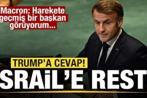 Trump’ın Birleşmiş Milletler (BM) Genel Konseyi’nde yaptığı konuşmaya atıfta bulunan Macron, “Harekete geçmiş, Nobel Barış Ödülü’nü istediğini söyleyen bir ABD Başkanı görüyorum. Bu sabah (BM) kürsüsünde bunu yineledi, ‘Barış istiyorum. Yedi çatışmayı çözdüm.’ Nobel Barış Mükafatı lakin (Gazze’deki) çatışmayı durdurursanız mümkün.” dedi.