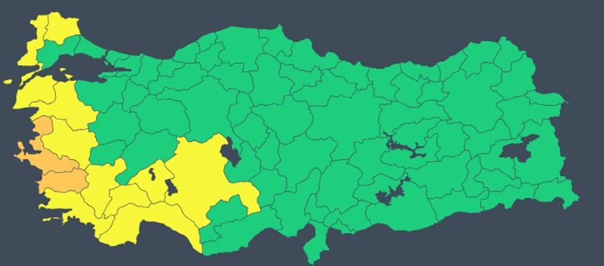 MGM İzmir ve Aydın için turuncu; Antalya, Balıkesir, Burdur, Çanakkale, Denizli, Edirne, Isparta, Kırklareli, Konya, Manisa ve Muğla için ise sarı kodlu gök gürültülü sağanak yağış ve fırtına ihtar yayınladı.
