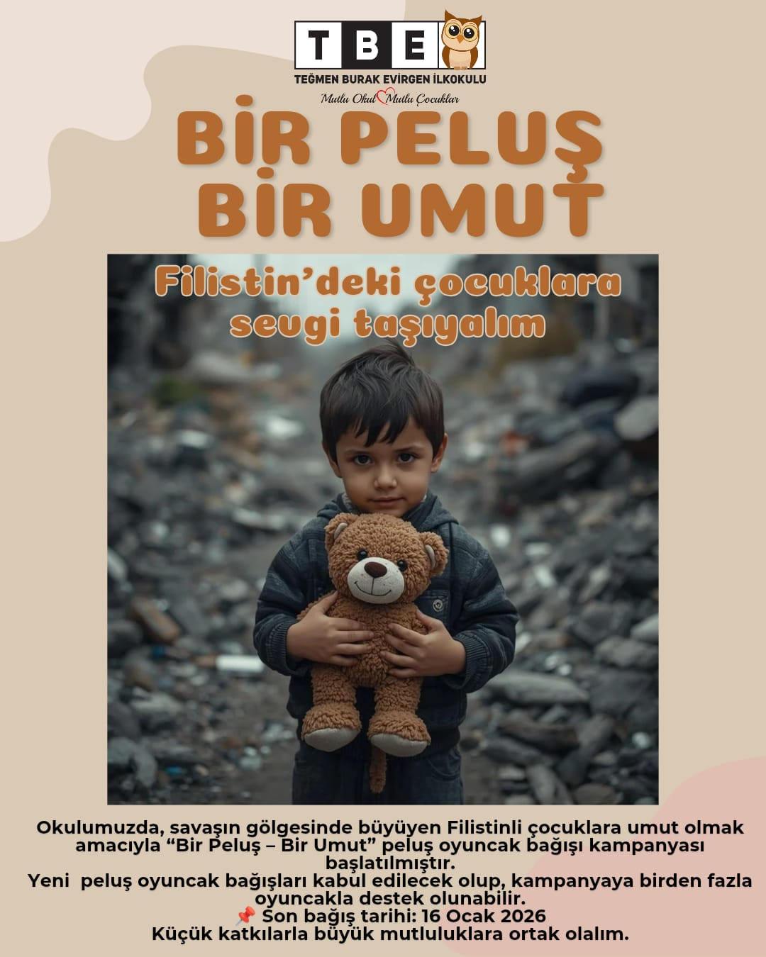 İstanbul Kartal’da Teğmen Burak Evirgen İlkokulu tarafından başlatılan, “Bir Peluş- Bir Umut” projesi ile öğrenciler oyuncak bağışında bulunmaya hazırlanıyor.