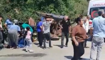 Düzce'de, fındık personellerinin taşındığı römorkun devrilmesi sonucu 7 kişi yola savrularak yaralandı.