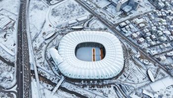 Bursa'da simge haline gelen yerler beyaza bürünürken, Timsah Arena Stadyumu'nun karla kaplı hali dron ile havadan görüntülendi.