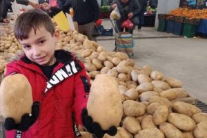 Dev patatesler, çocukların da ilgisini çekti. Anne ve babasından müsaade alarak tezgaha yaklaşan küçük Yağız Sarıkaya, iki dev patatesi eline alarak fotoğraf çektirmeyi ihmal etmedi.