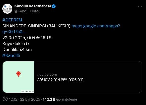 Kandilli’den yapılan paylaşımda, Balıkesir Sındırgı’da 5.0 büyüklüğünde sarsıntı meydana geldi. 74. kilometre derinlikte meydana gelen sarsıntı birçok vilayette hissedildi.