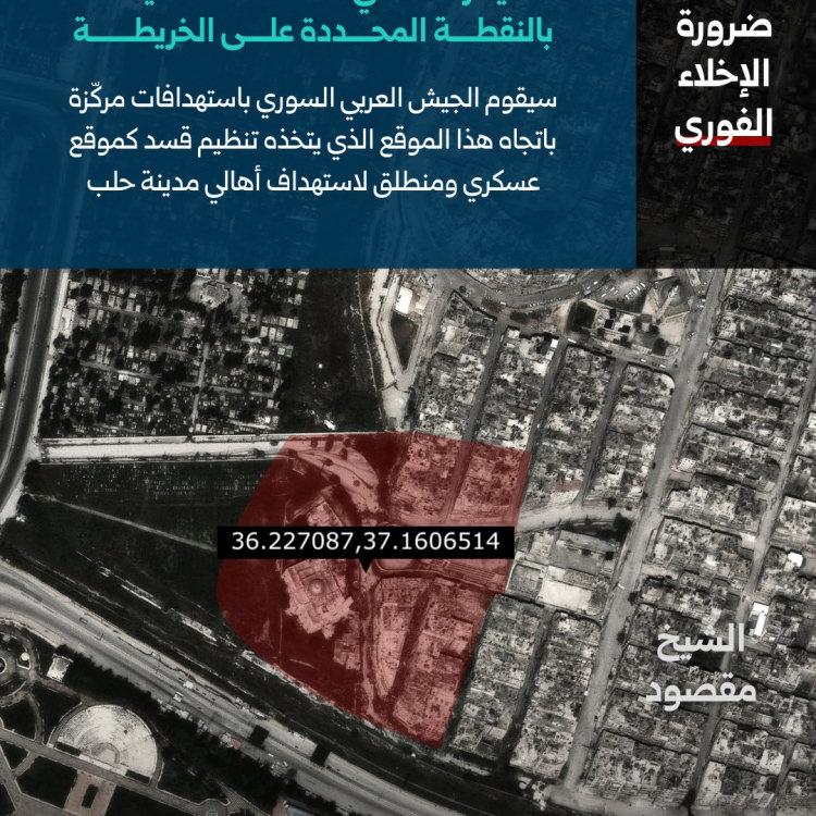 Bu yerlerin amaç alınacağı belirtilerek bölgedeki sivillere kelam konusu noktalardan uzak durmaları daveti yapıldı. Açıklamada ayrıyeten, bölgedeki sivillerden mahallî saatle 16.00 ila 18.00 saatleri ortasında açık olan insani koridor üzerinden Pir Maksud’dan tahliye olmaları istendi.