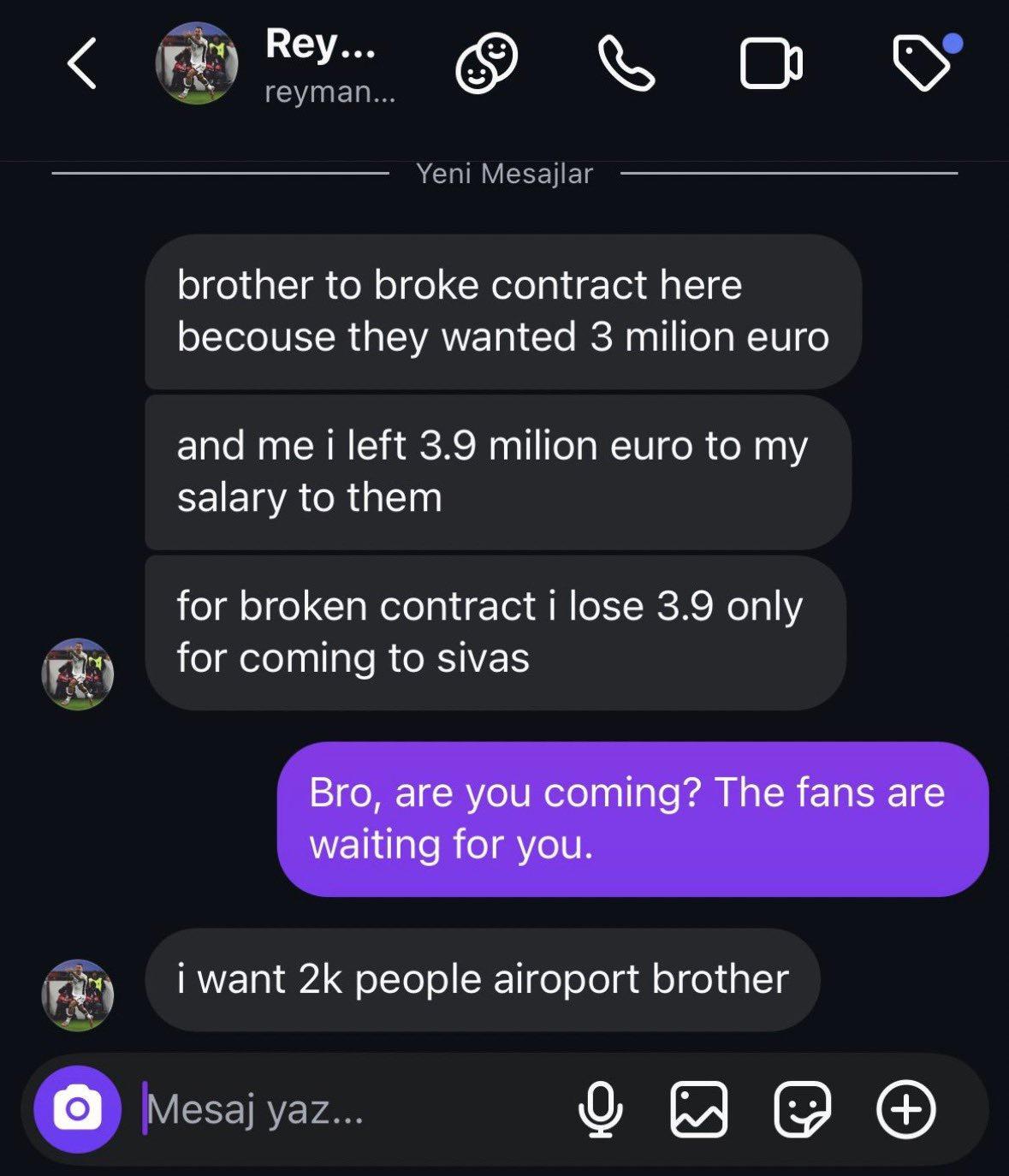 28 yaşındaki deneyimli futbolcunun, taraftarla yazışmasında “Sözleşmemi feshetmek için 3.9 milyon eurodan vazgeçtim. Yalnızca Sivas için. Bu ekiple Muhteşem Lig’e çıkmak için gelirim” sözleri taraftarı heyecanlandırdı.