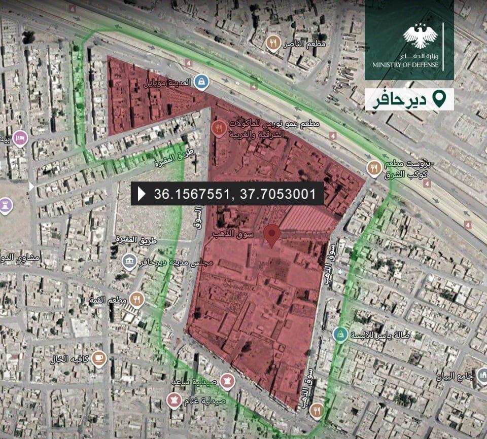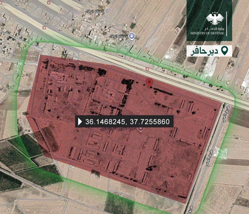 Suriye Savunma Bakanlığı, SDG tarafından askeri üs olarak kullanıldığı saptanan noktaların kesin coğrafik koordinatları kırmızı alanlarla belirtiyor. Bu noktaların sivil yerleşim yerlerine yönelik hücumlar için kullanıldığı vurgulanarak operasyon düzenleneceği tarafında evvelden ihtar yapılıyor. Deyr Hafir bölgesindeki stratejik binalar ve ulaşım çizgileri üzerindeki askeri yerleşimlerin de benzeri formda hava fotoğrafları ile dijital ortamda haritalandırıldığı görüldü.