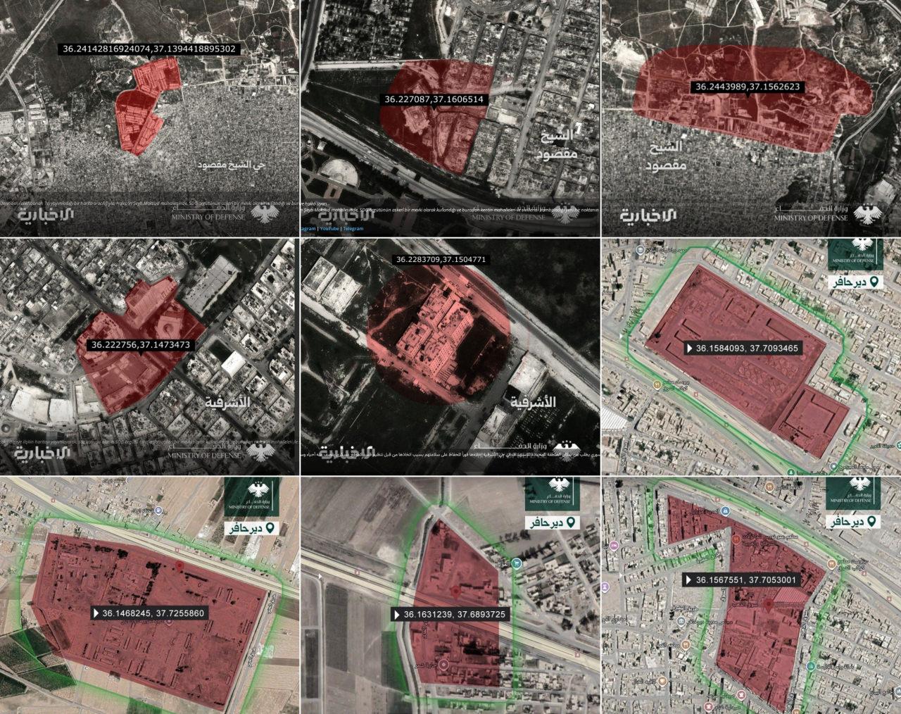 Suriye ordusu, SDG/YPG ögelerine operasyon yapmadan evvel amaç alınacak hassas noktalara ilişkin harita ve hava fotoğraflarını yayımlıyor ve bölge sakinlerinden bu alanlardan hemen uzaklaşmalarını istiyor.