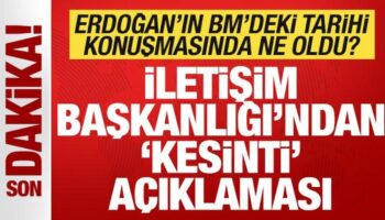 Son dakika haberi… Cumhurbaşkanı Erdoğan’ın Birleşmiş Milletler Genel Şurası’na (BMGK) konuşma yaptığı sırada mikrofonu kapandı. İrtibat Başkanlığı, Erdoğan’ın BM’deki konuşmasının 5 dakika hududu nedeniyle kesildiğini bildirdi.