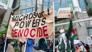 ABD merkezli teknoloji devi Microsoft’un çalışanları ve aktivistler, soykırımcı İsrail ordusuyla iş birliği yaptığı gerekçesiyle şirketin Washington eyaletindeki genel merkezinin önünde hareket yaptı.