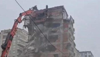 Diyarbakır’ın Bağlar ilçesinde 6 Şubat sarsıntılarında ağır hasar alan 8 katlı bina, denetimli yıkım sırasında saniyeler içinde çöktü.