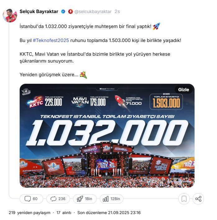 “İstanbul’da 1 milyon 32 bin kişi ile harika bir final yaptık. Bu yıl TEKNOFEST 2025 ruhunu toplamda 1 milyon 503 bin kişi ile birlikte yaşadık. KKTC, Mavi Vatan ve İstanbul’da bizimle birlikte yol yürüyen herkese şükranlarımı sunuyorum. Yine görüşmek üzere…”
