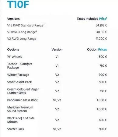 Hem T10X hem de T10F’in arttan itişli, standart menzilli V1 versiyonlarının fiyatı 34 bin 295 euro olarak belirlendi. Uzun menzilli, geriden itişli V1 versiyonlarının fiyatı 40 bin 118 euro olurken; V2 donanım paketli, uzun menzilli modellerin fiyatı ise 41 bin 200 euro olarak açıklandı. Almanya’daki teslimatlar Ocak 2026’da başlayacak.
