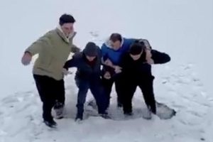 Trabzon’da donmuş göl üzerinde tehlikeli bir oyun oynayan gençler, topluca zıplamaya başlayınca buz katmanı tartıya dayanamadı. Kırılan buzla birlikte suya düşen kümenin o anları kaygı yarattı.