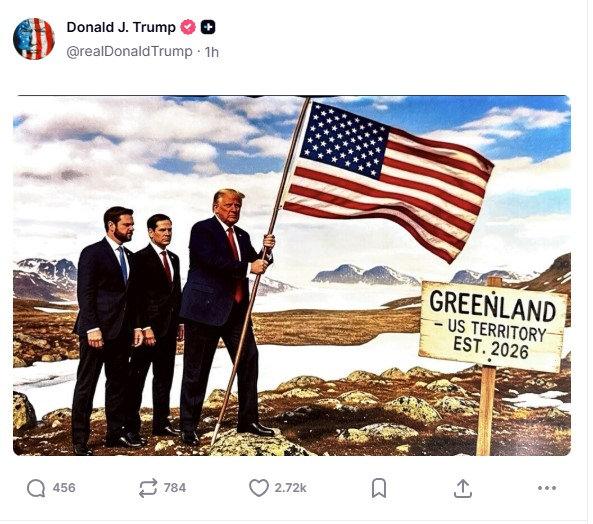 Ayrıca yayınlanan öbür bir görselde Trump’ın kendisine yakın iki isimle birlikte “Grönland – ABD Toprağı – Kuruluş 2026” yazan bir tabelanın yanına ABD bayrağı dikerken resmedilmiş.