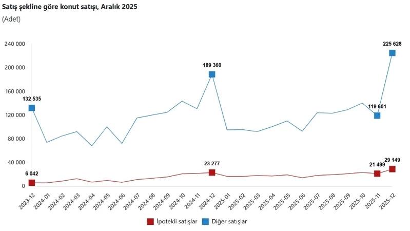 Türkiye genelinde ipotekli konut satışları aralık ayında bir evvelki yılın birebir ayına nazaran yüzde 25,2 oranında artarak 29 bin 149 oldu. 2025 yılında gerçekleşen ipotekli konut satışları ise bir evvelki yıla nazaran yüzde 49,3 oranında artarak 236 bin 668 oldu. Toplam konut satışları içinde ipotekli satışların hissesi Aralık ayında yüzde 11,4, 2025 yılında yüzde 14,0 olarak gerçekleşti.