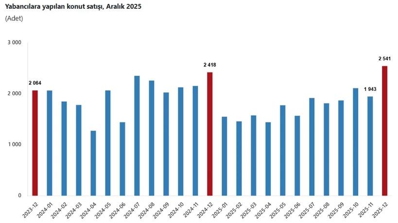 2025 yılında ülke uyruklarına nazaran en fazla konut satışı sırasıyla 3 bin 649 ile Rusya Federasyonu, bin 878 ile İran ve bin 541 ile Ukrayna vatandaşlarına yapıldı. Aralık ayında ise sırasıyla 504 ile Rusya Federasyonu, 232 ile İran ve 193 ile Ukrayna vatandaşlarına yapıldı.