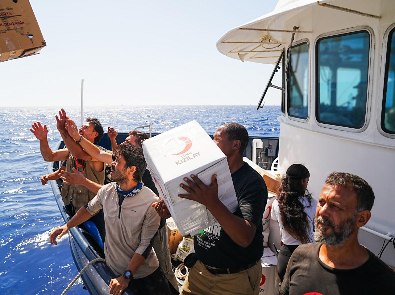 Türk Kızılay takımı, teknelere ulaşarak besin ve ilaç yardımlarını teslim etti. Yardım çalışması havadan da görüntülendi.