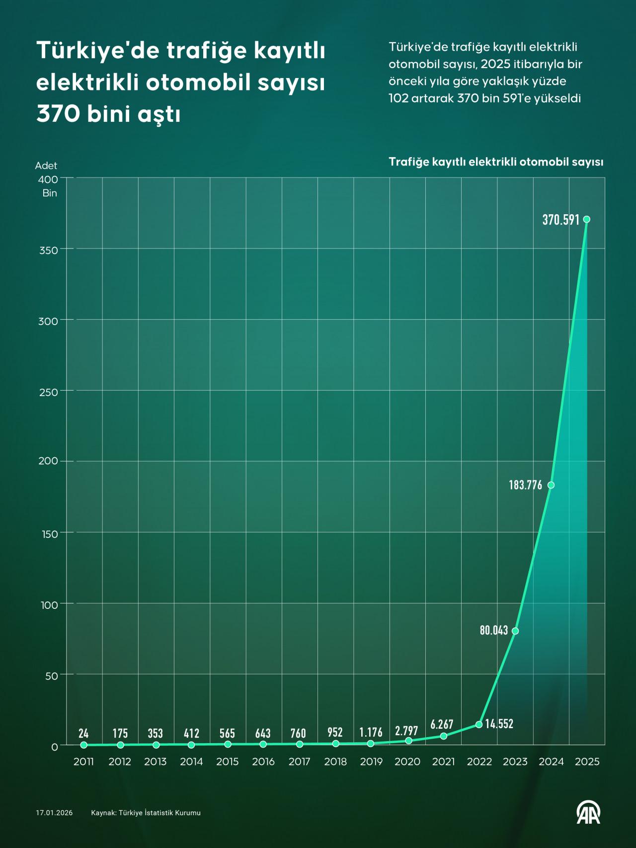 Trafiğe kayıtlı elektrikli araba sayısı, 2015’te sadece 565 iken, 2024’te 183 bin 776’ya, Aralık 2025 prestijiyle da 370 bin 591’e ulaştı. 2025’te yıllık bazda artış oranı, yaklaşık yüzde 102 olarak kayıtlara geçti. Geçen yıl prestijiyle elektrikli arabaların kayıtlı arabalar içindeki hissesi, yüzde 2,1 olarak hesaplandı. 2024’te ise bu oran, yüzde 1,1 düzeyindeydi.