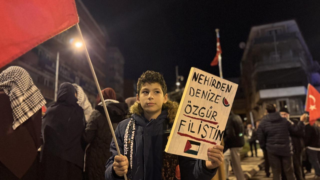 Kültür Park’taki 3 Ocak Atatürk Meydanı önünde toplanan küme, Türk ve Filistin bayrakları taşıdı, attıkları sloganlarla İsrail’e reaksiyon gösterdi.
