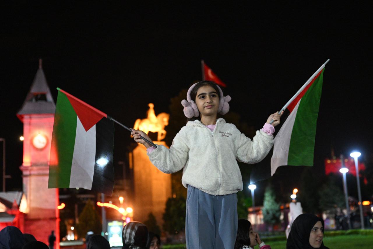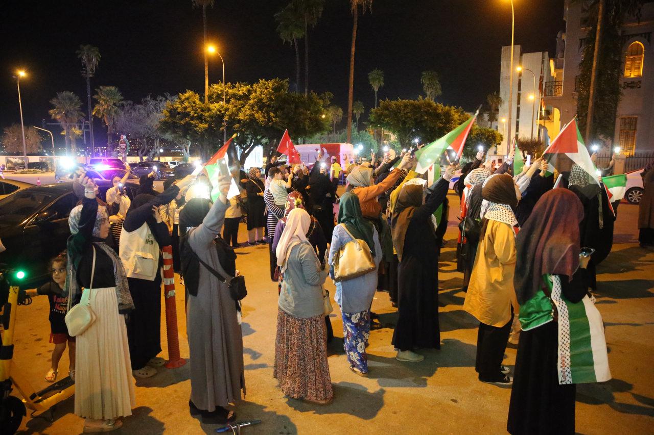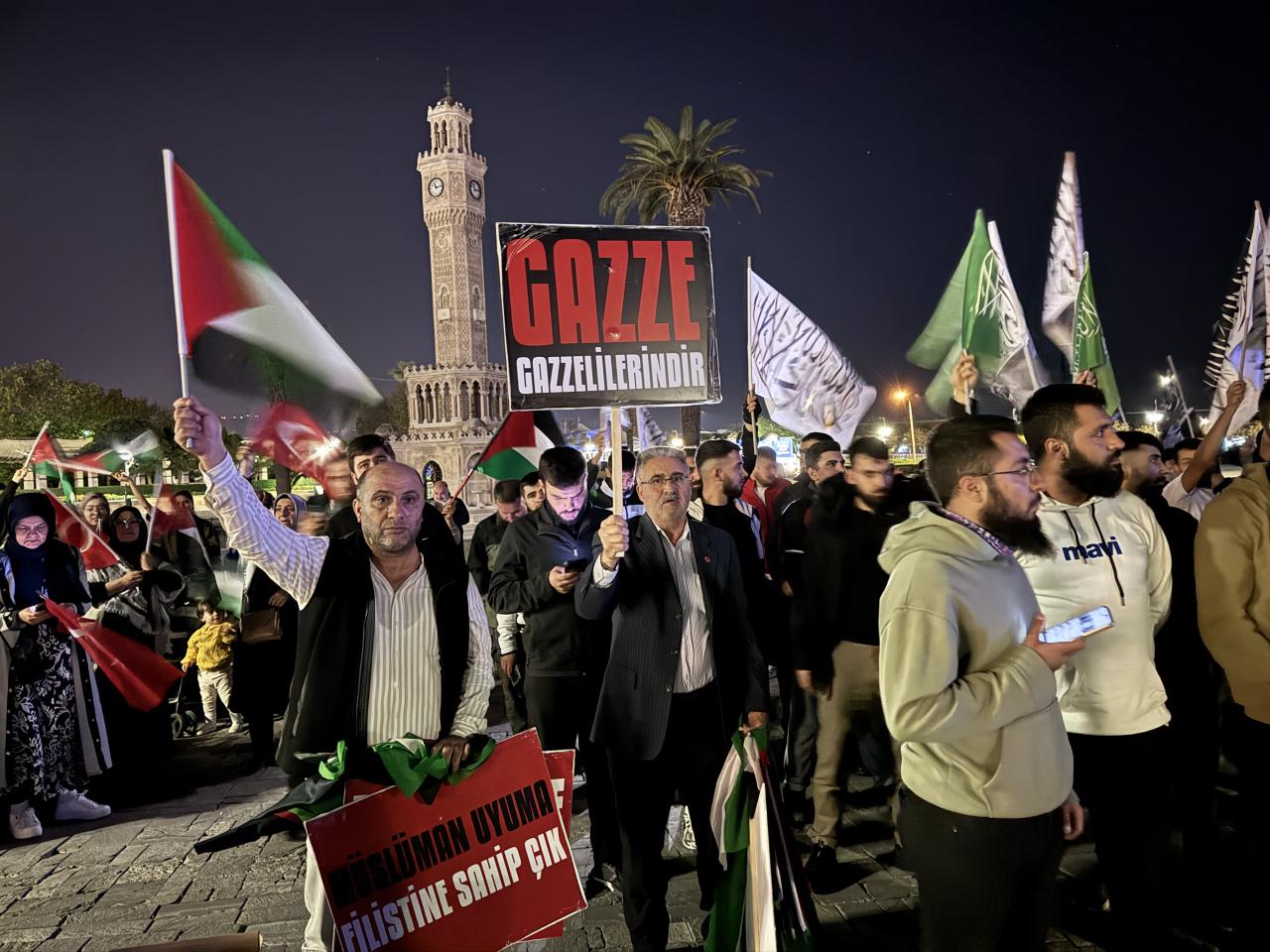 İzmir’de Konak Meydanı’ndan toplanan çok sayıda kişi, İsrail aleyhine slogan attı. Ellerindeki Türk ve Filistin bayrakları ile çeşitli pankartlar taşıyan vatandaşlar, tekbir getirdi.