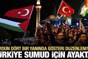 Mavi Marmara Gemisi’nde bulunan eski AK Parti Düzce Milletvekili İbrahim Korkmaz’ın da katıldığı harekette, vatandaşlar ellerinde Filistin bayrakları ve pankartlarla İsrail’in Sumud Filosu’na yönelik saldırısına reaksiyon gösterdi.
