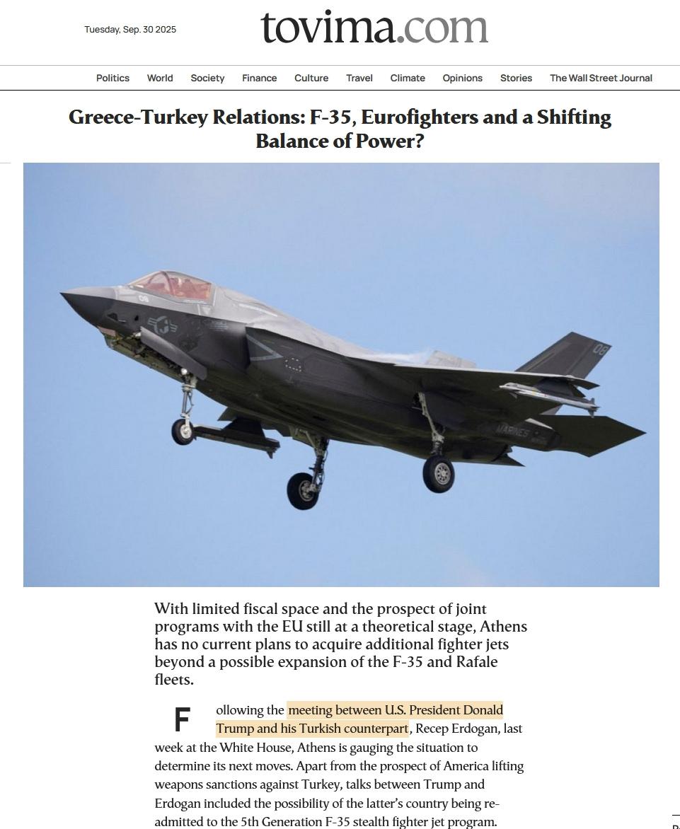 Atina merkezli To Vima gazetesi, Türkiye Cumhurbaşkanı Recep Tayyip Erdoğan’ın ABD Başkanı Donald Trump ile yaptığı görüşmenin akabinde, Yunanistan’ın askeri istikrarlar açısından önemli bir hesap içine girdiğini yazdı. Habere nazaran, Türkiye’nin tekrar F-35 hayalet savaş uçağı programına dahil edilme ihtimali ve buna ek olarak Eurofighter jetleri için Almanya ile görüşmelerine odaklanıldı. Atina’nın sınırlı mali imkanları nedeniyle savunma kapasitesini artırma konusunda ihtiyatlı davrandığı vurgulandı.