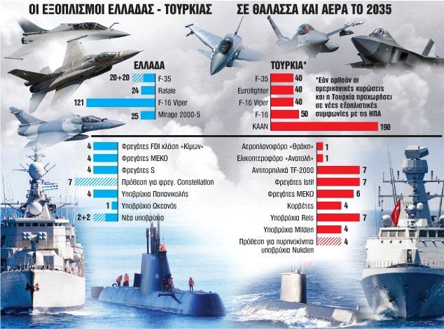 To Vima gazetesinin haberinde ayrıyeten Türkiye ile Yunanistan’ın hava ve denizdeki askerî gücünün mukayesesi yapıldı. ABD ile yapılacak mümkün mutabakatlarda envantere katılması beklenen hava araçlarıyla birlikte Türkiye’nin 2035 yılında Yunanistan’dan üstün düzeye ulaşacağı belirtildi.